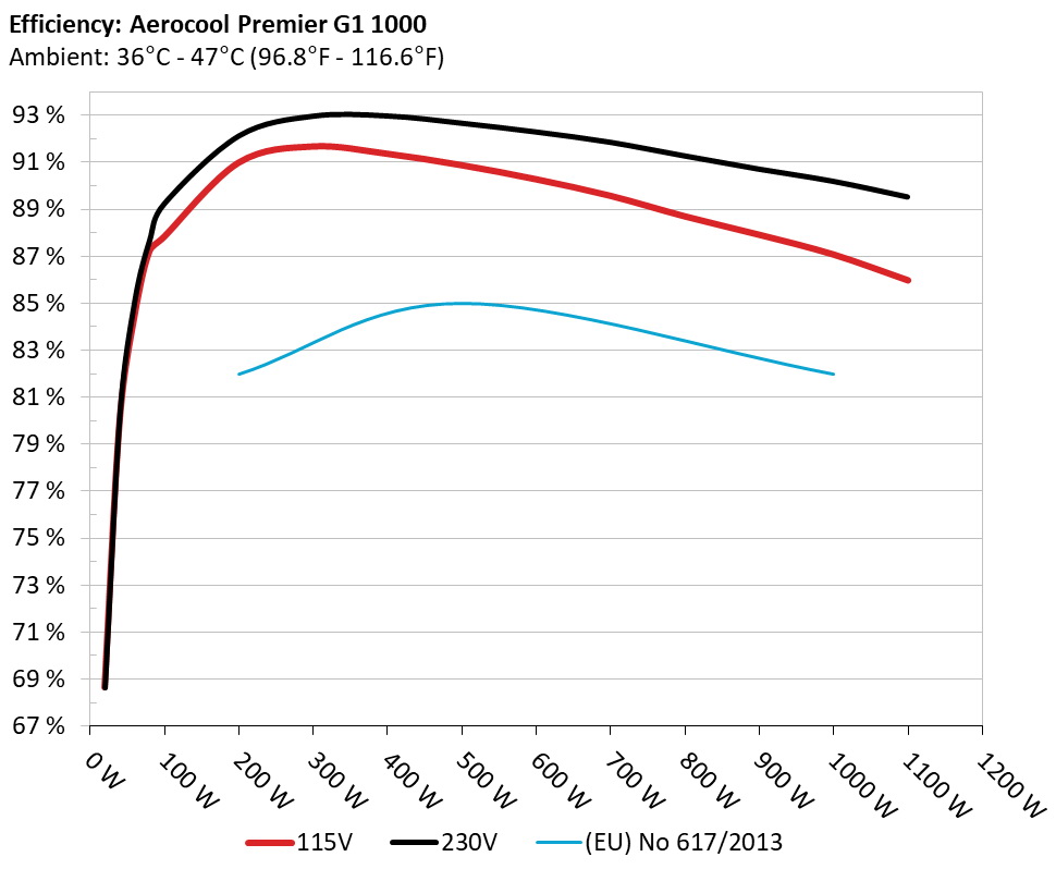 The PSU`s efficiency under high ambient temperatures with 115V and 230V input. For this graph the results of the 10-110% load regulation table are used
