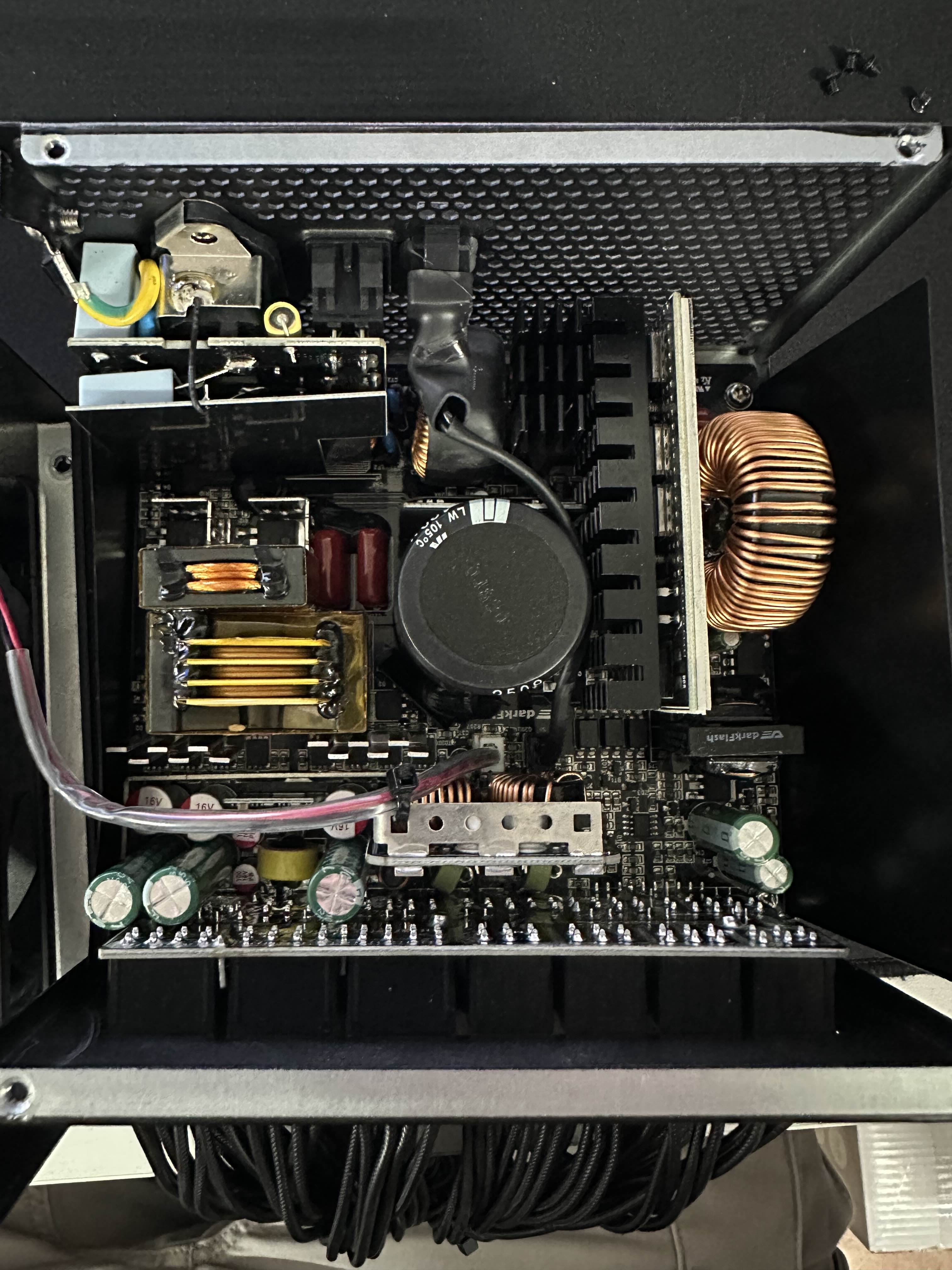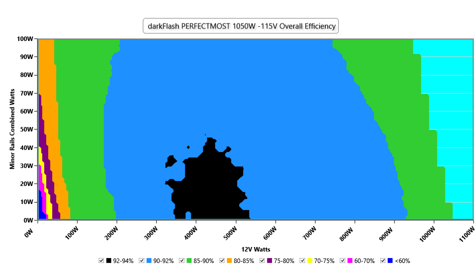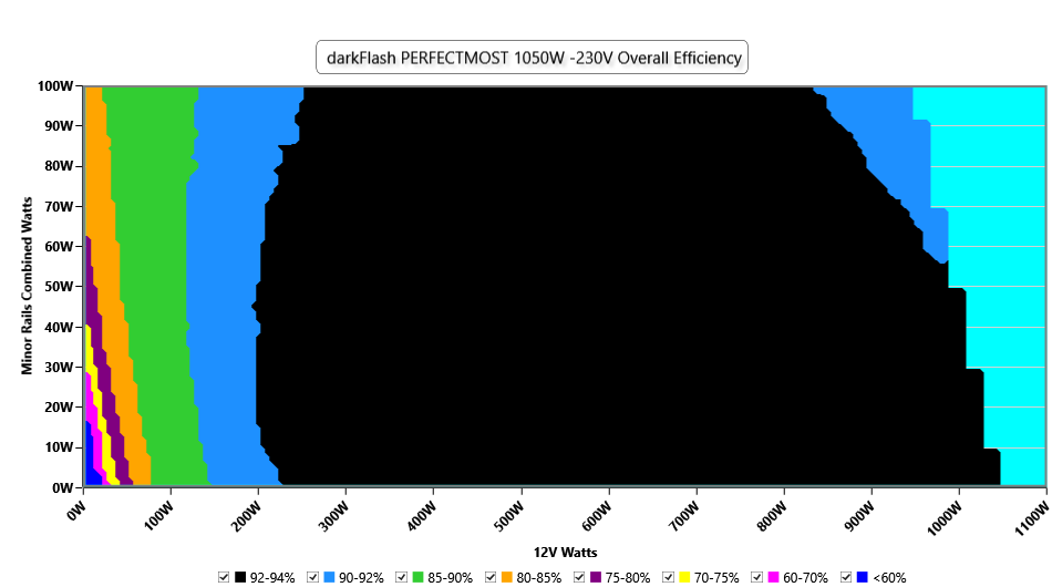This graph depicts the PSU`s efficiency throughout its entire operational range. For the generation of the efficiency and noise graphs we set our loaders to auto mode through our custom-made software before trying thousands of possible load combinations