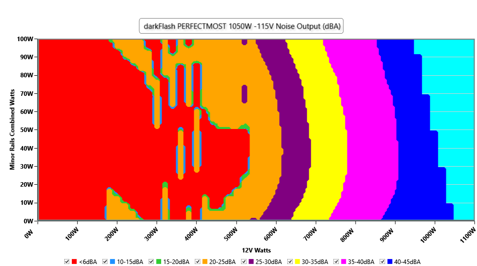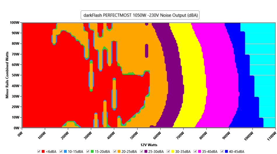 The PSU`s noise in its entire operational range and under 30-32 °C ambient is depicted in this graph. The X axis represents the load on the +12V rail(s) while the Y axis is the load on the minor rails