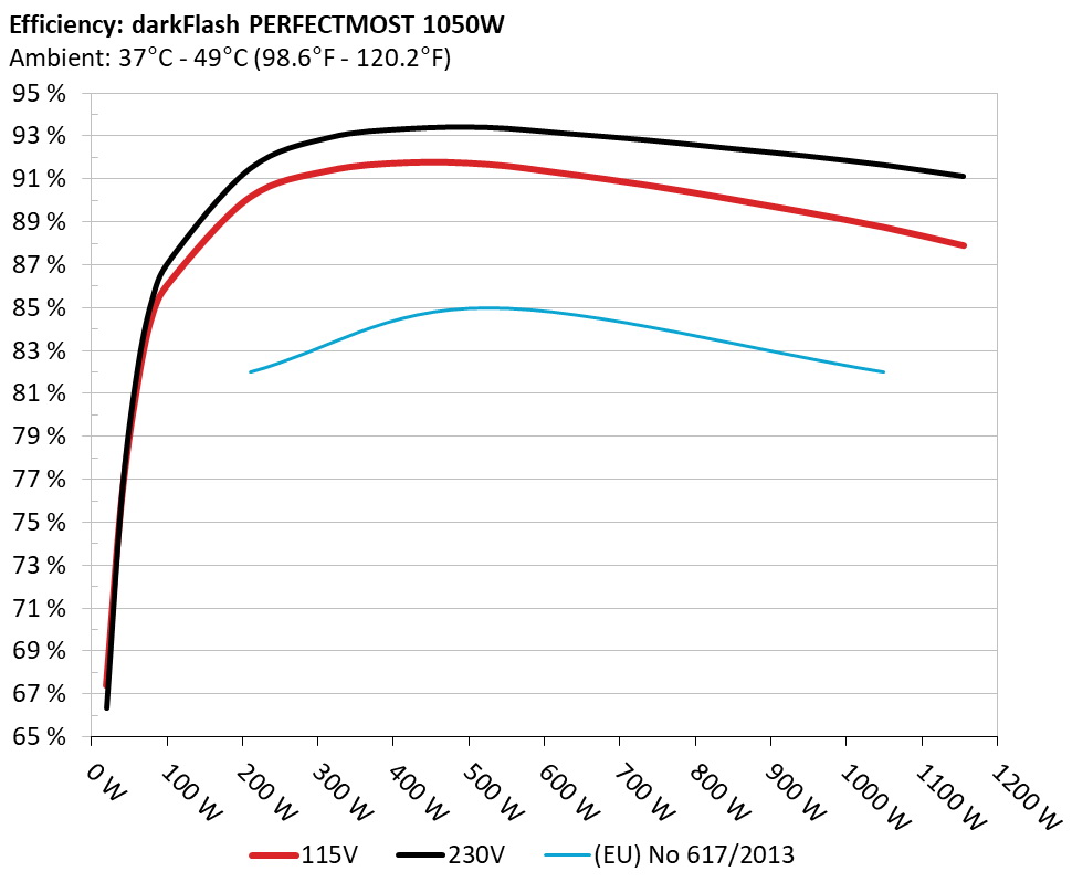 The PSU`s efficiency under high ambient temperatures with 115V and 230V input. For this graph the results of the 10-110% load regulation table are used