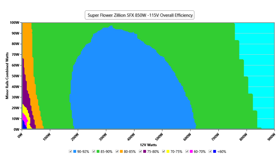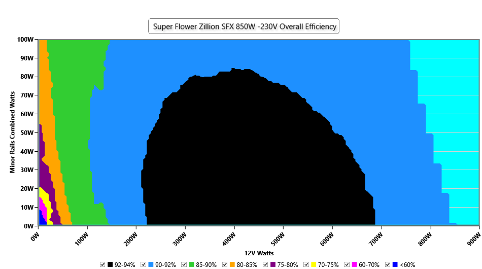 This graph depicts the PSU`s efficiency throughout its entire operational range. For the generation of the efficiency and noise graphs we set our loaders to auto mode through our custom-made software before trying thousands of possible load combinations