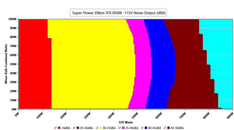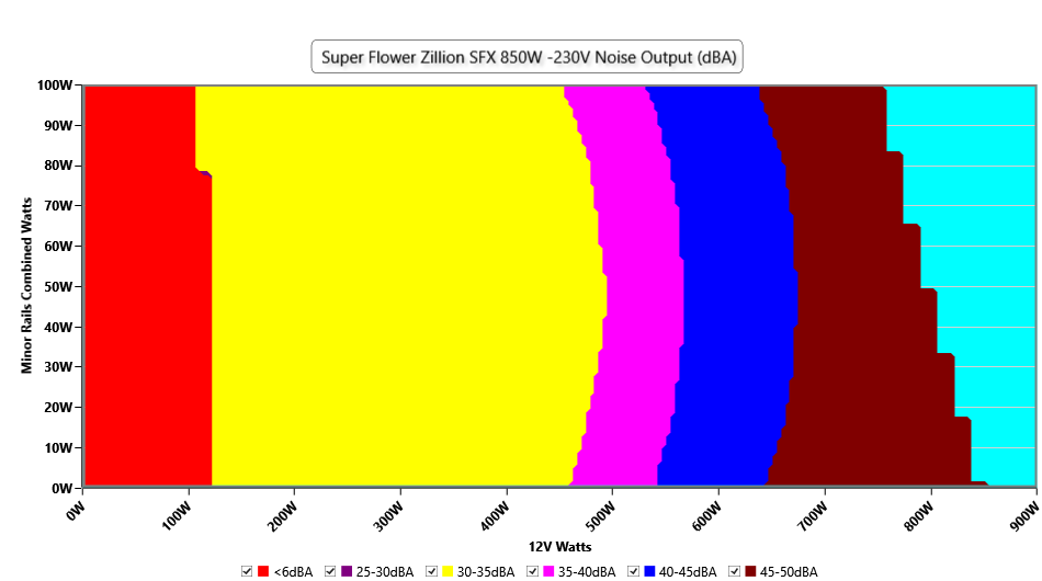 The PSU`s noise in its entire operational range and under 30-32 °C ambient is depicted in this graph. The X axis represents the load on the +12V rail(s) while the Y axis is the load on the minor rails