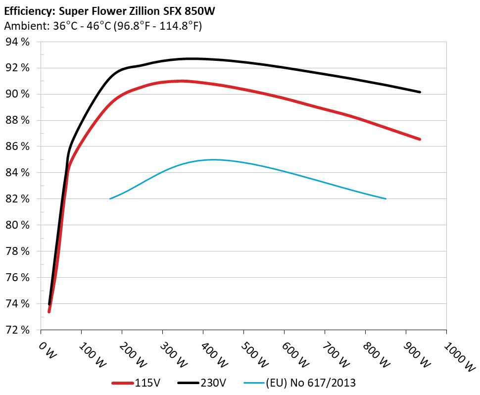 The PSU`s efficiency under high ambient temperatures with 115V and 230V input. For this graph the results of the 10-110% load regulation table are used
