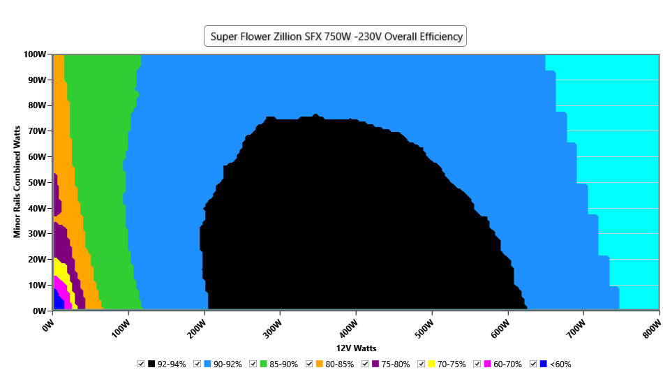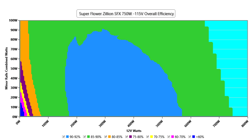 This graph depicts the PSU`s efficiency throughout its entire operational range. For the generation of the efficiency and noise graphs we set our loaders to auto mode through our custom-made software before trying thousands of possible load combinations