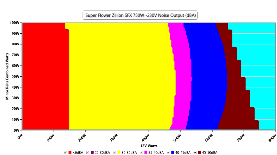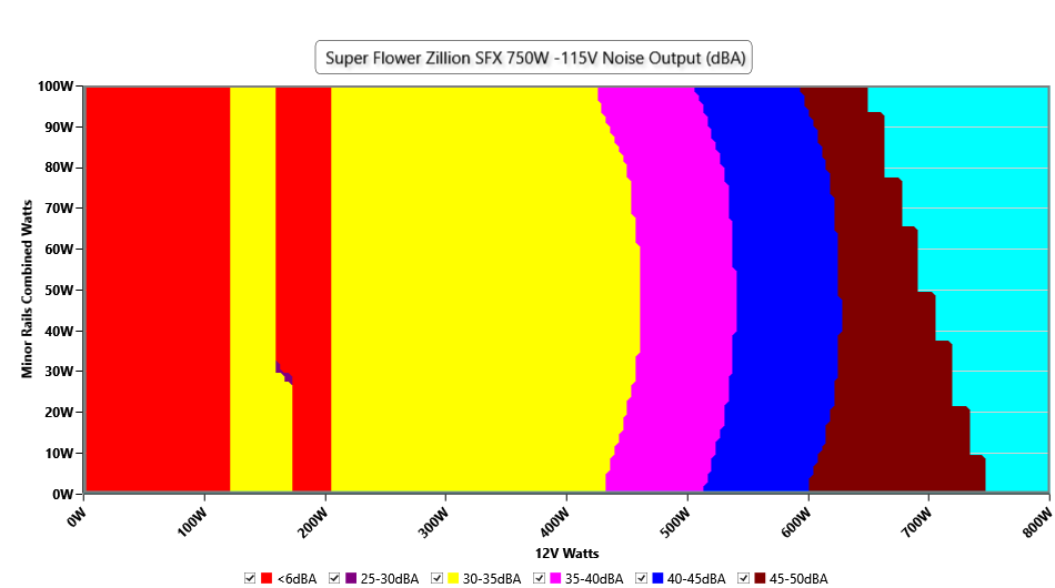 The PSU`s noise in its entire operational range and under 30-32 °C ambient is depicted in this graph. The X axis represents the load on the +12V rail(s) while the Y axis is the load on the minor rails