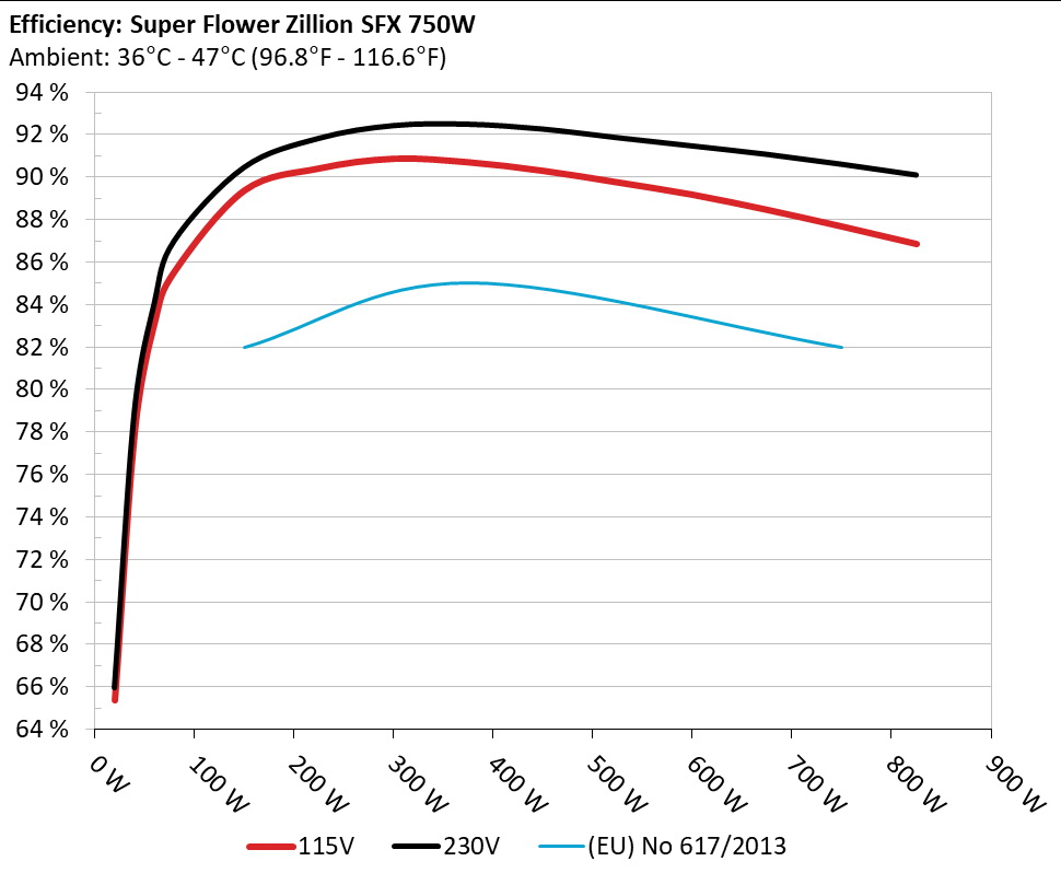 The PSU`s efficiency under high ambient temperatures with 115V and 230V input. For this graph the results of the 10-110% load regulation table are used