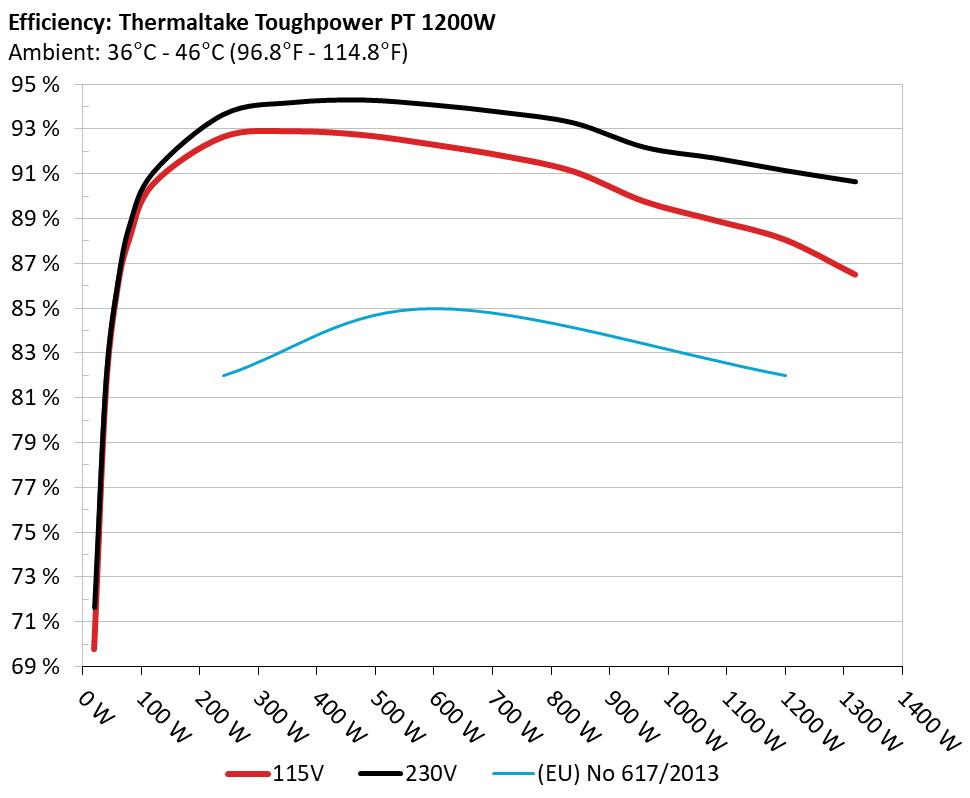 The PSU`s efficiency under high ambient temperatures with 115V and 230V input. For this graph the results of the 10-110% load regulation table are used