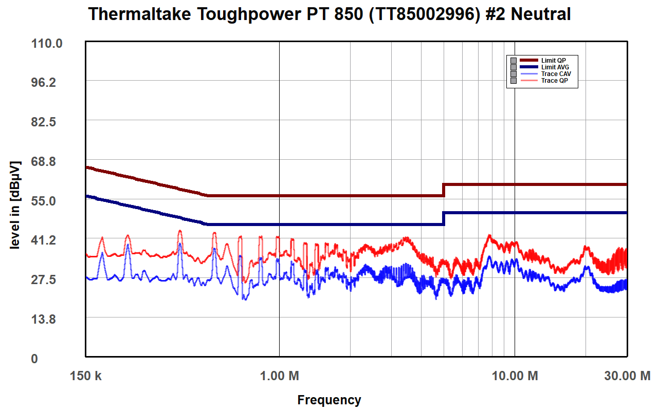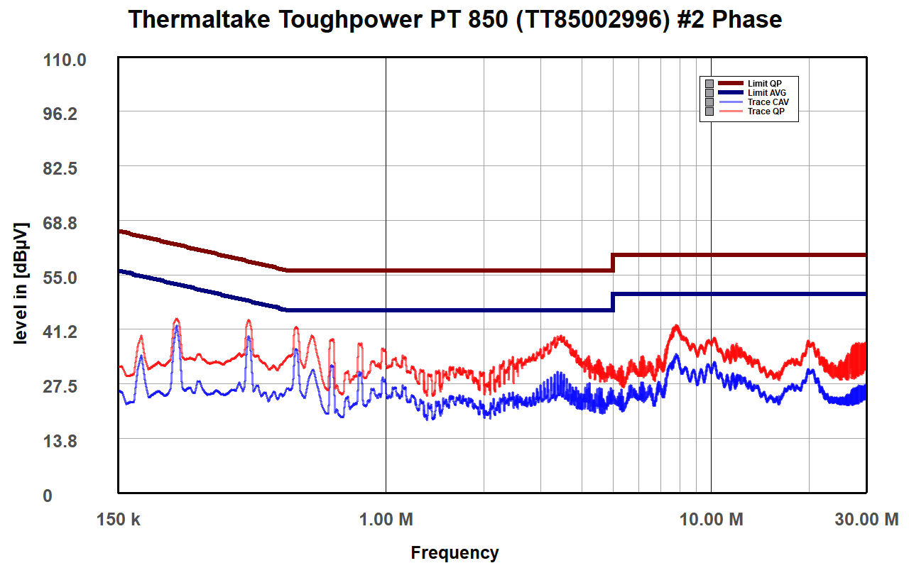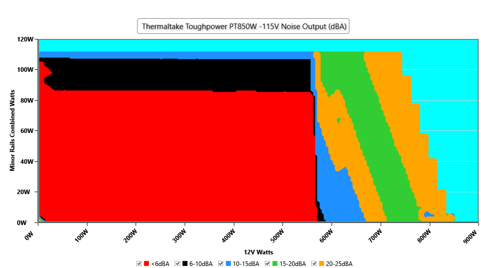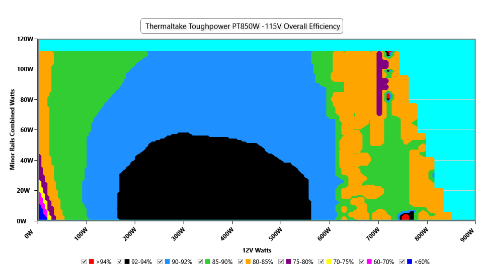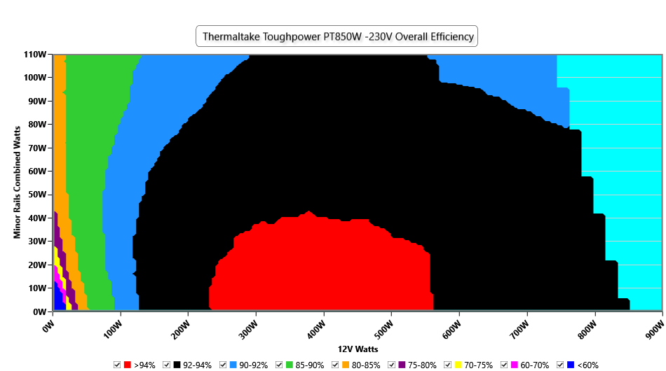 This graph depicts the PSU`s efficiency throughout its entire operational range. For the generation of the efficiency and noise graphs we set our loaders to auto mode through our custom-made software before trying thousands of possible load combinations
