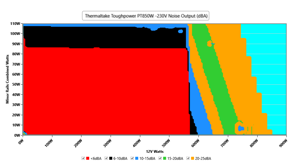 The PSU`s noise in its entire operational range and under 30-32 °C ambient is depicted in this graph. The X axis represents the load on the +12V rail(s) while the Y axis is the load on the minor rails