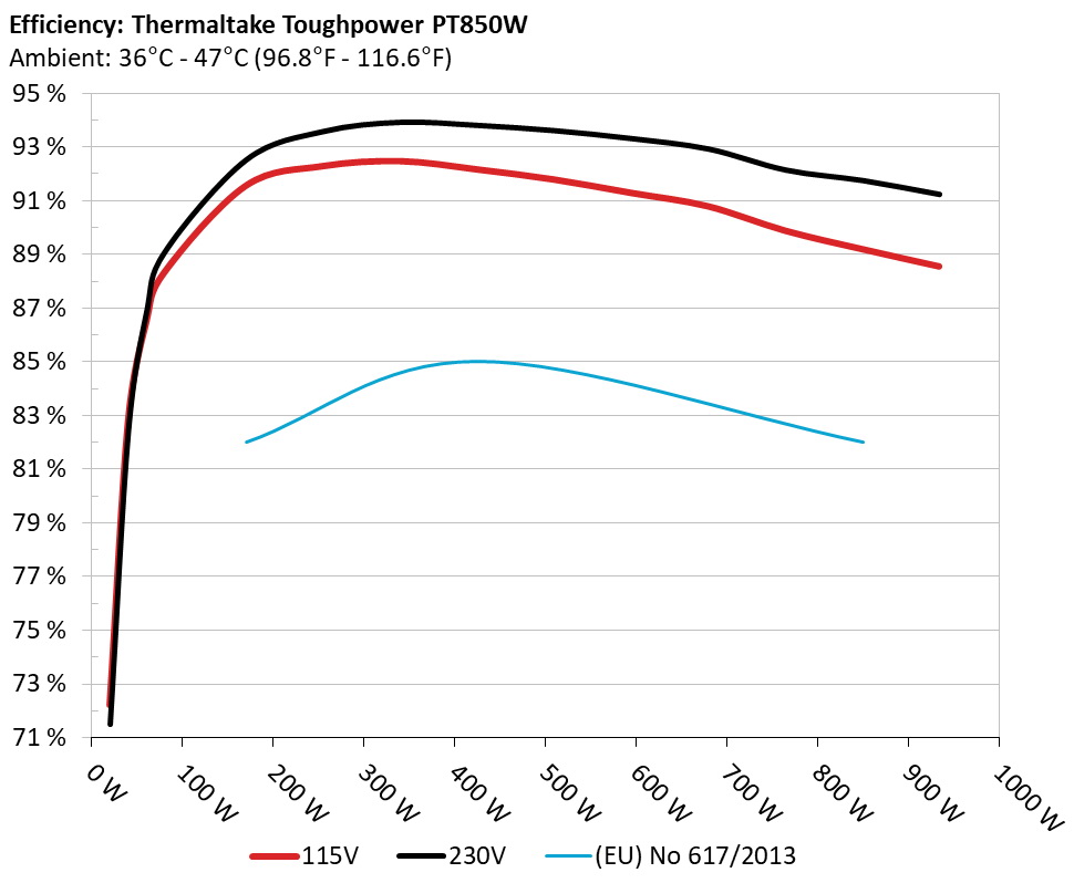 The PSU`s efficiency under high ambient temperatures with 115V and 230V input. For this graph the results of the 10-110% load regulation table are used