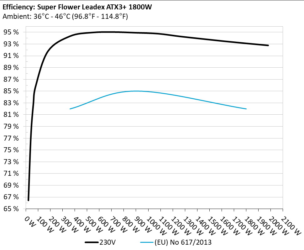 The PSU`s efficiency under high ambient temperatures with 115V and 230V input. For this graph the results of the 10-110% load regulation table are used