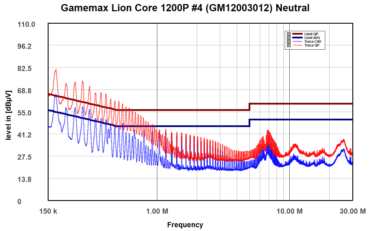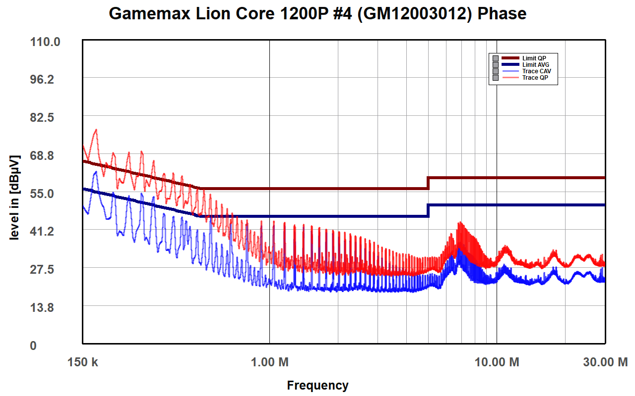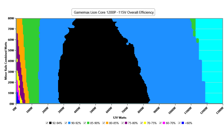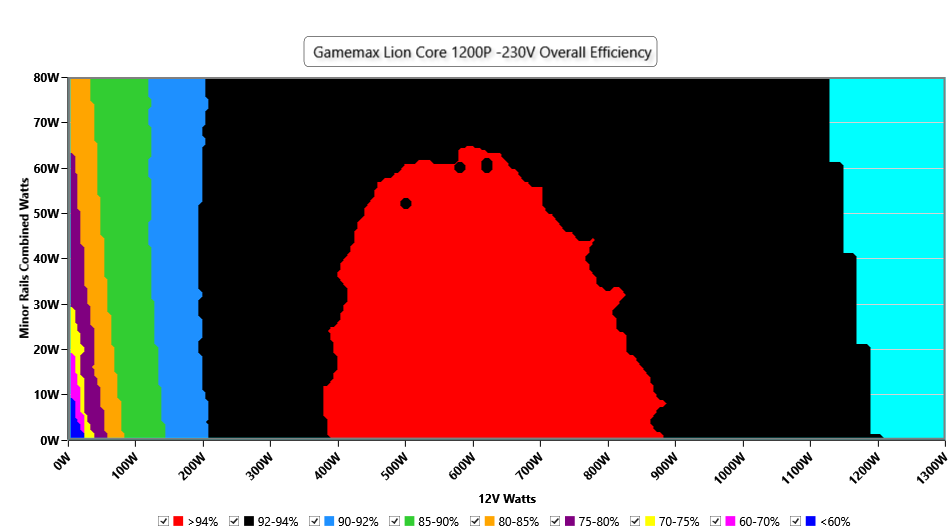 This graph depicts the PSU`s efficiency throughout its entire operational range. For the generation of the efficiency and noise graphs we set our loaders to auto mode through our custom-made software before trying thousands of possible load combinations