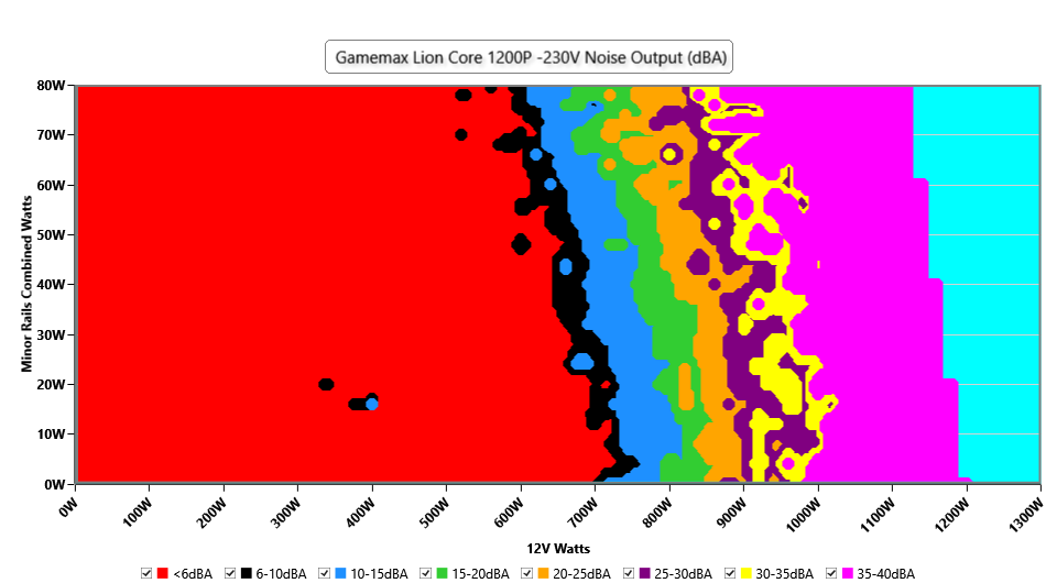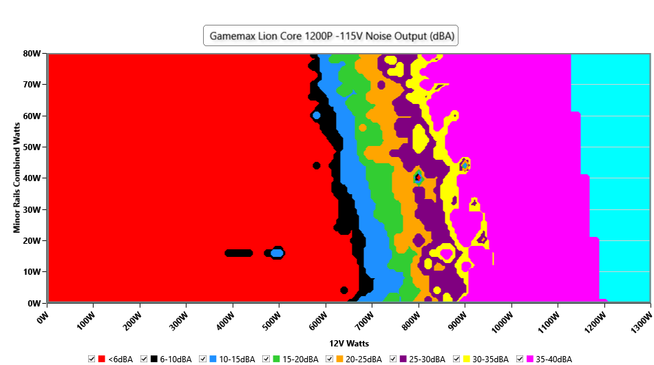 The PSU`s noise in its entire operational range and under 30-32 °C ambient is depicted in this graph. The X axis represents the load on the +12V rail(s) while the Y axis is the load on the minor rails