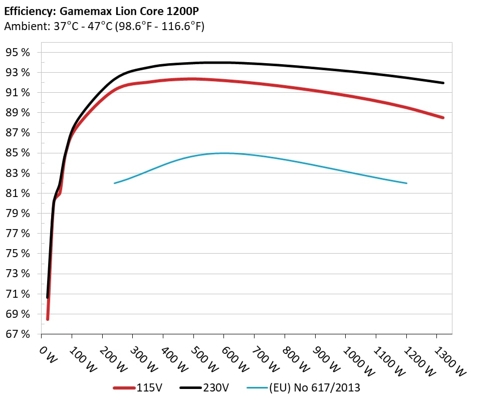 The PSU`s efficiency under high ambient temperatures with 115V and 230V input. For this graph the results of the 10-110% load regulation table are used