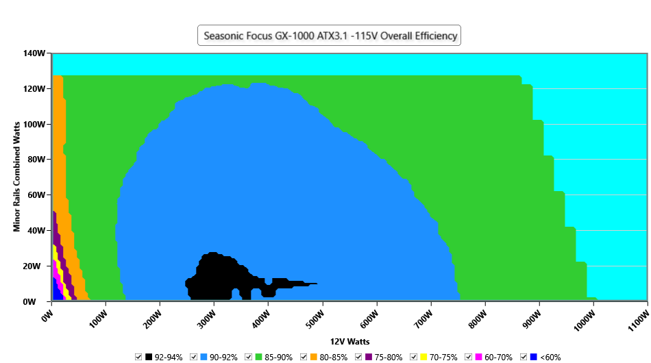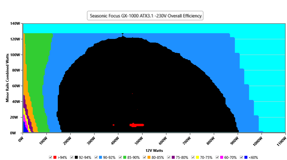 This graph depicts the PSU`s efficiency throughout its entire operational range. For the generation of the efficiency and noise graphs we set our loaders to auto mode through our custom-made software before trying thousands of possible load combinations