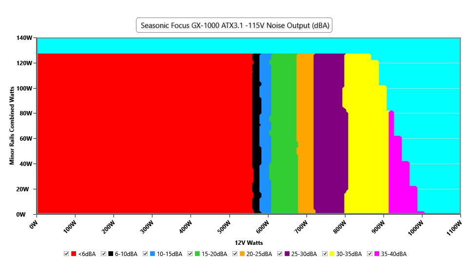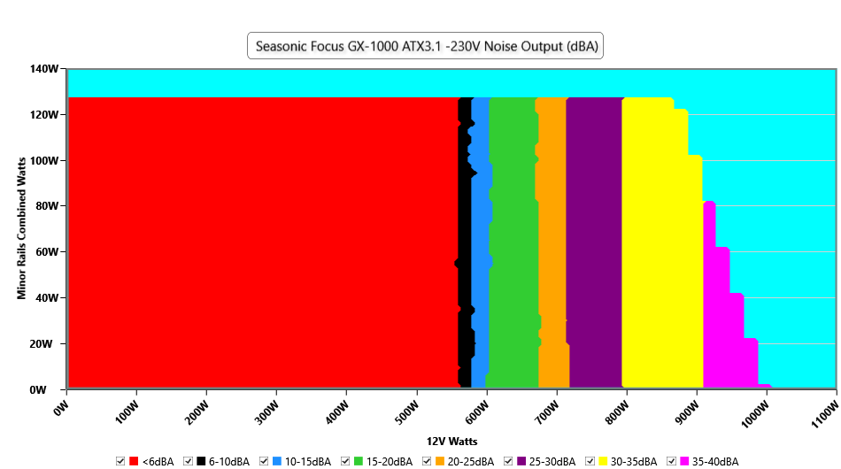 The PSU`s noise in its entire operational range and under 30-32 °C ambient is depicted in this graph. The X axis represents the load on the +12V rail(s) while the Y axis is the load on the minor rails