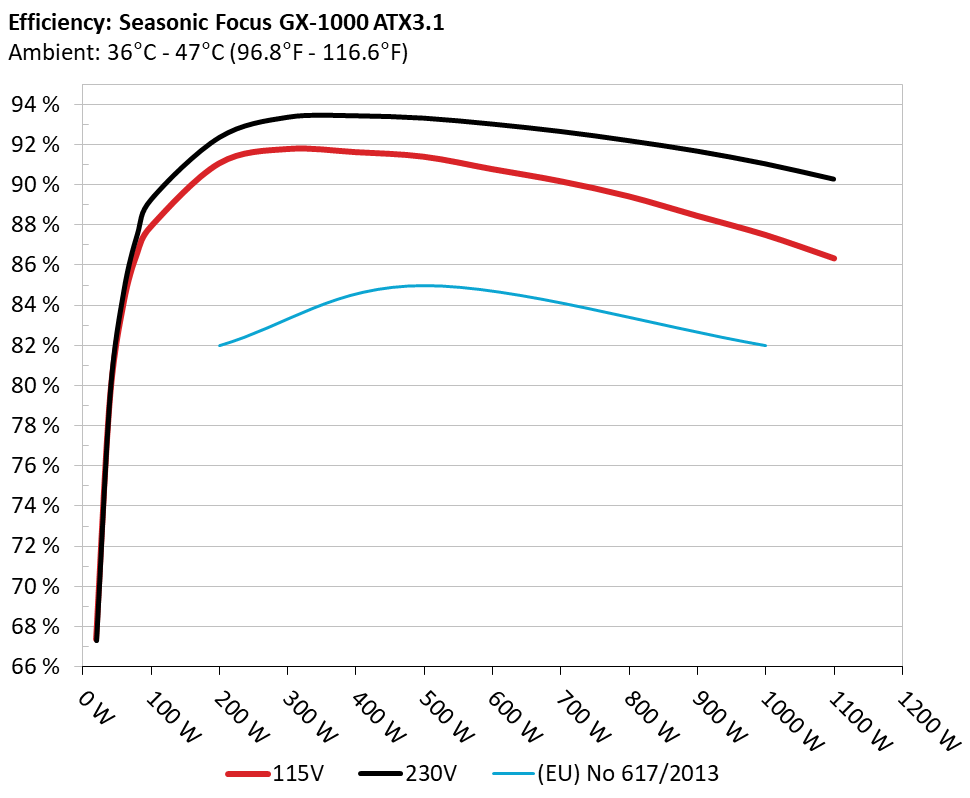The PSU`s efficiency under high ambient temperatures with 115V and 230V input. For this graph the results of the 10-110% load regulation table are used