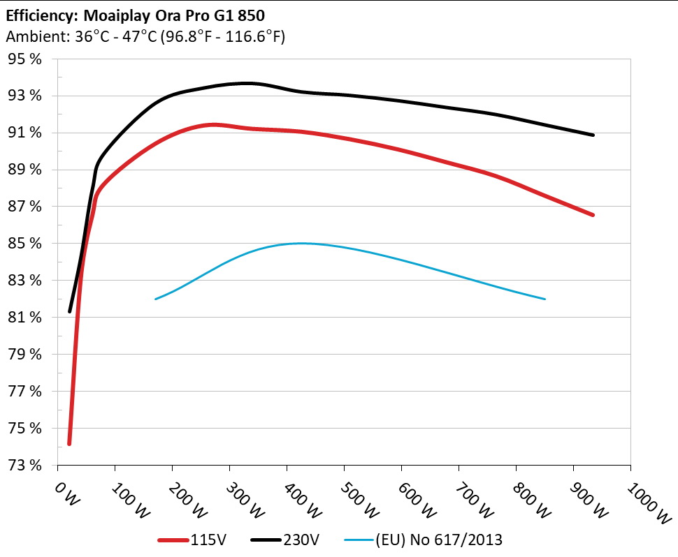 The PSU`s efficiency under high ambient temperatures with 115V and 230V input. For this graph the results of the 10-110% load regulation table are used