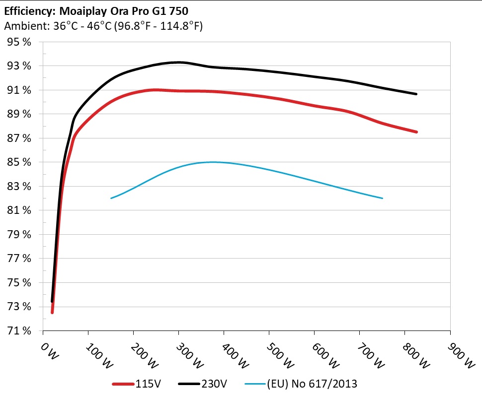 The PSU`s efficiency under high ambient temperatures with 115V and 230V input. For this graph the results of the 10-110% load regulation table are used