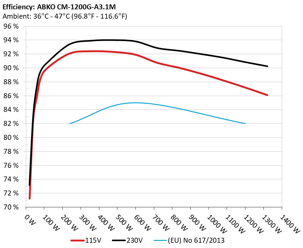 The PSU`s efficiency under high ambient temperatures with 115V and 230V input. For this graph the results of the 10-110% load regulation table are used