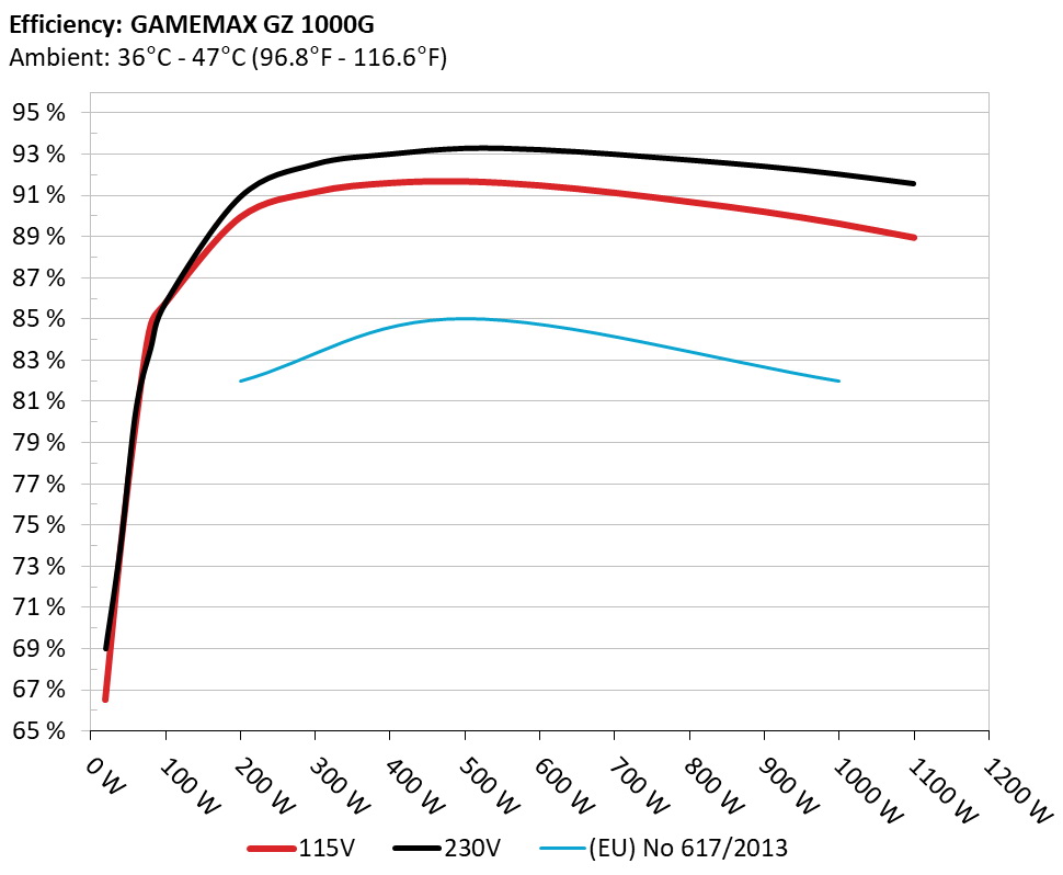 The PSU`s efficiency under high ambient temperatures with 115V and 230V input. For this graph the results of the 10-110% load regulation table are used