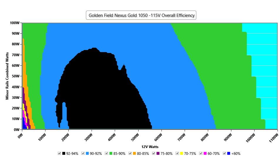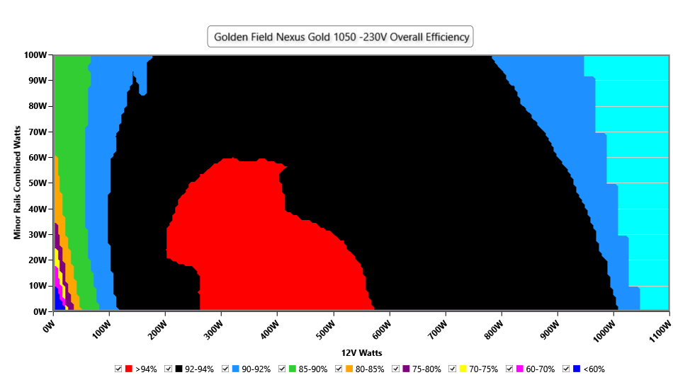 This graph depicts the PSU`s efficiency throughout its entire operational range. For the generation of the efficiency and noise graphs we set our loaders to auto mode through our custom-made software before trying thousands of possible load combinations