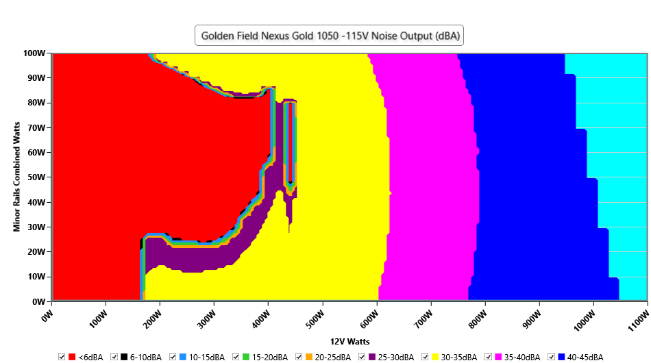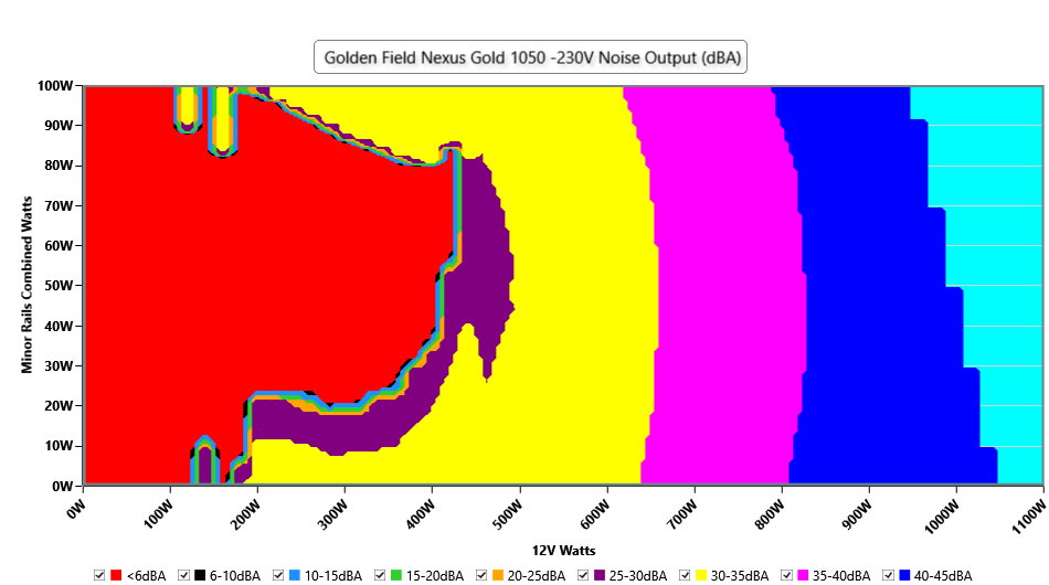 The PSU`s noise in its entire operational range and under 30-32 °C ambient is depicted in this graph. The X axis represents the load on the +12V rail(s) while the Y axis is the load on the minor rails