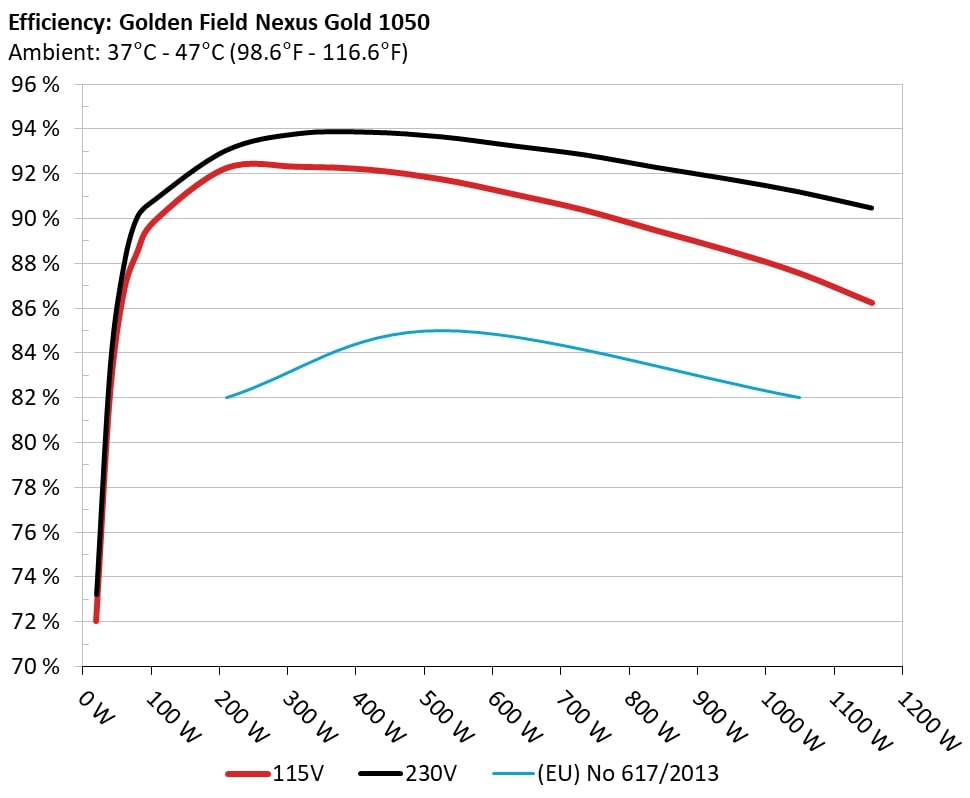 The PSU`s efficiency under high ambient temperatures with 115V and 230V input. For this graph the results of the 10-110% load regulation table are used