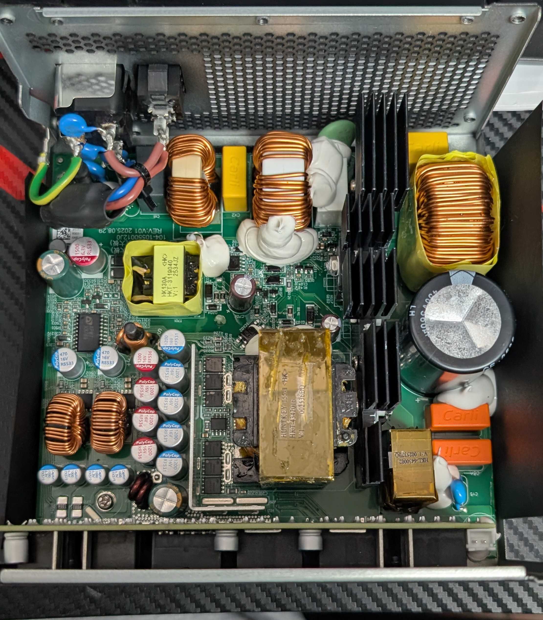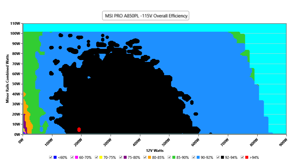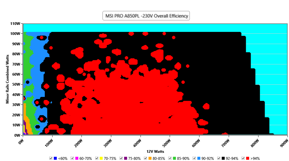 This graph depicts the PSU`s efficiency throughout its entire operational range. For the generation of the efficiency and noise graphs we set our loaders to auto mode through our custom-made software before trying thousands of possible load combinations