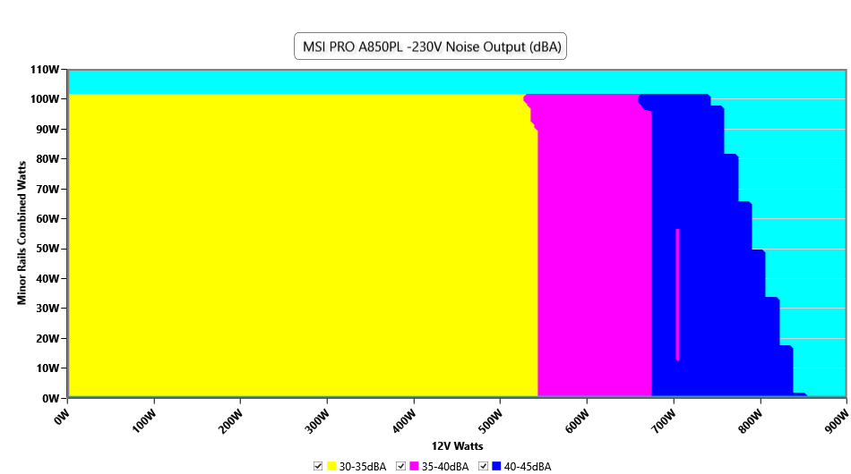 The PSU`s noise in its entire operational range and under 30-32 °C ambient is depicted in this graph. The X axis represents the load on the +12V rail(s) while the Y axis is the load on the minor rails