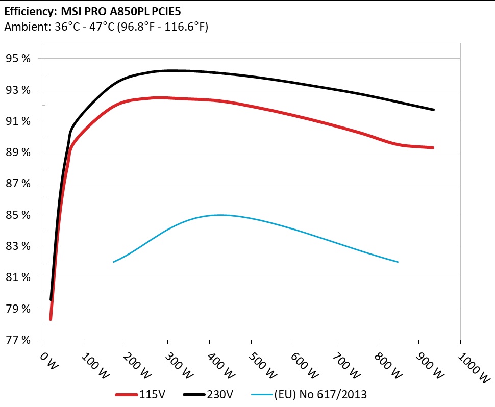 The PSU`s efficiency under high ambient temperatures with 115V and 230V input. For this graph the results of the 10-110% load regulation table are used