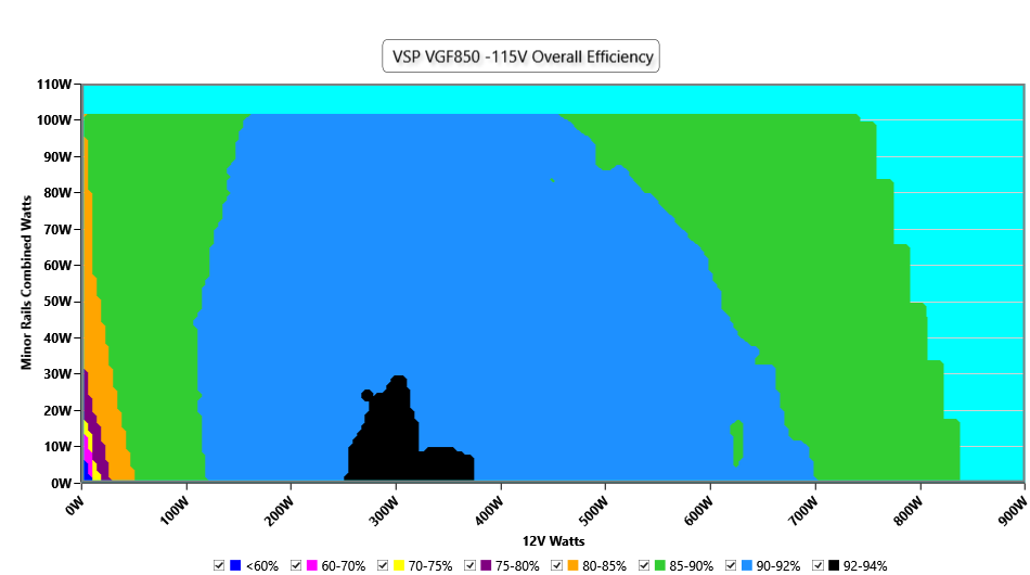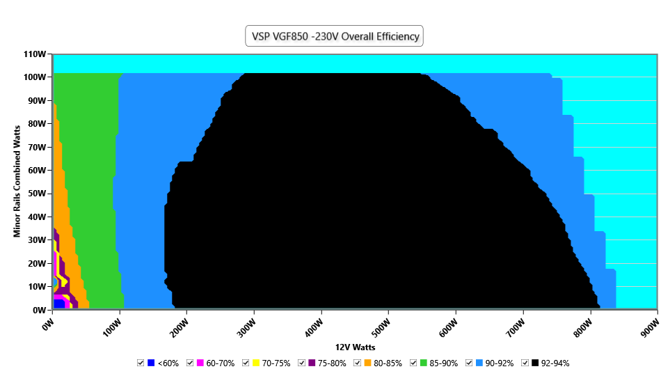 This graph depicts the PSU`s efficiency throughout its entire operational range. For the generation of the efficiency and noise graphs we set our loaders to auto mode through our custom-made software before trying thousands of possible load combinations
