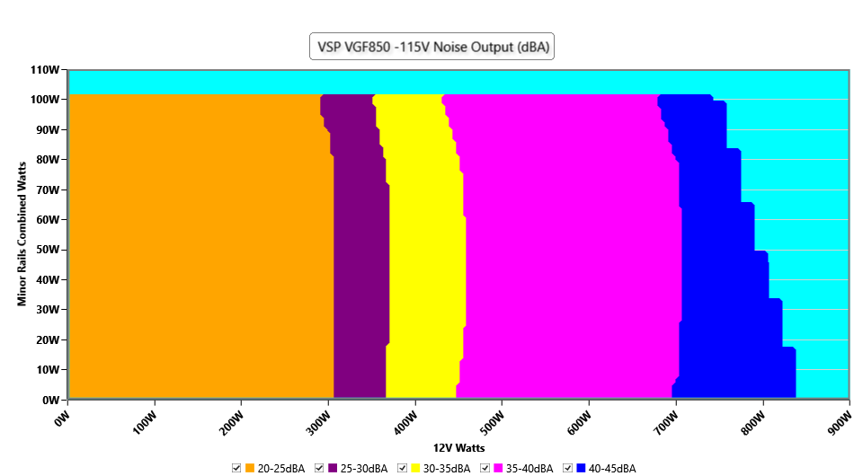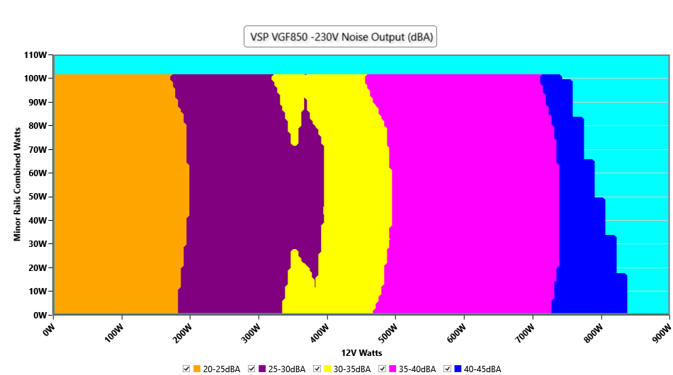 The PSU`s noise in its entire operational range and under 30-32 °C ambient is depicted in this graph. The X axis represents the load on the +12V rail(s) while the Y axis is the load on the minor rails