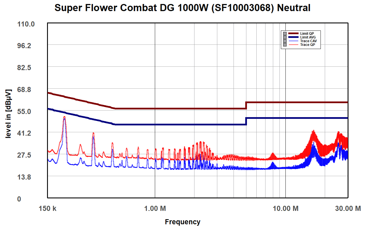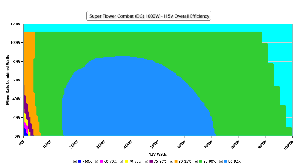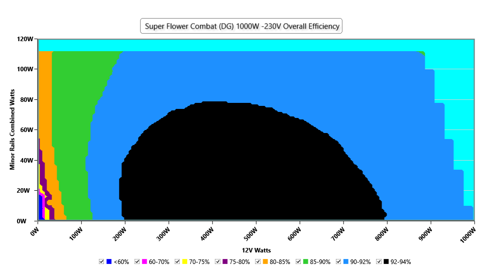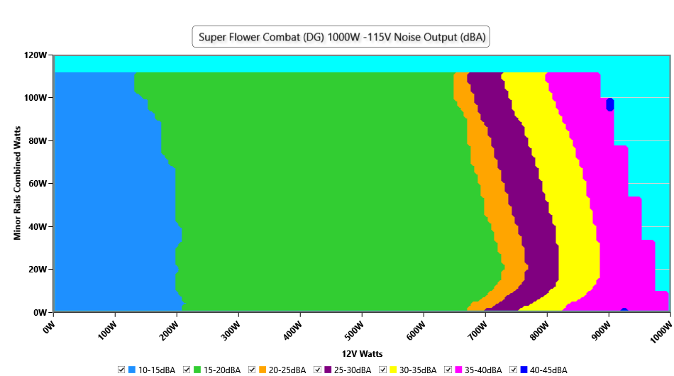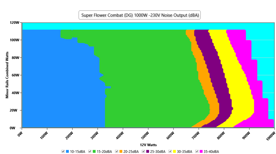 This graph depicts the PSU`s efficiency throughout its entire operational range. For the generation of the efficiency and noise graphs we set our loaders to auto mode through our custom-made software before trying thousands of possible load combinations
