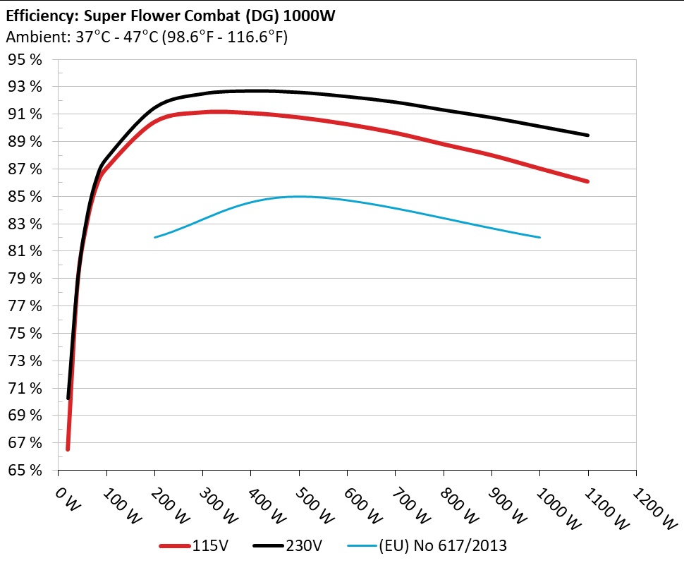 The PSU`s efficiency under high ambient temperatures with 115V and 230V input. For this graph the results of the 10-110% load regulation table are used