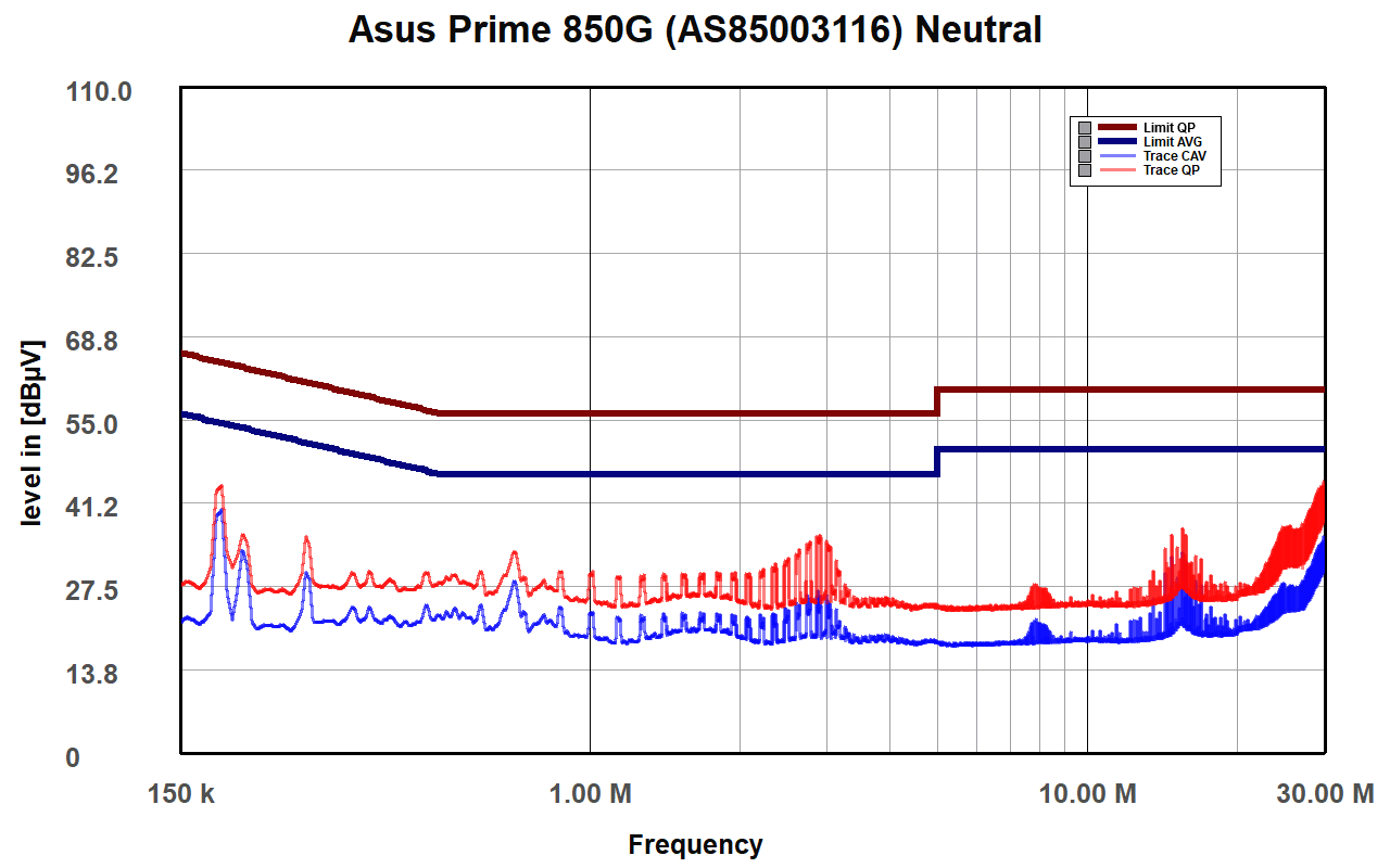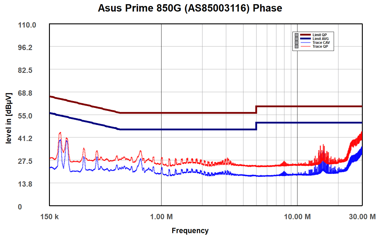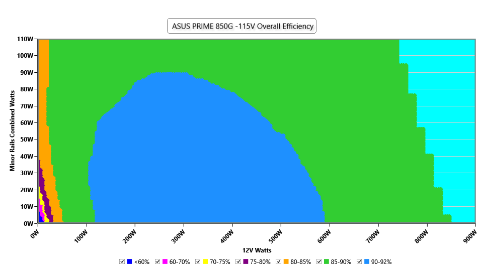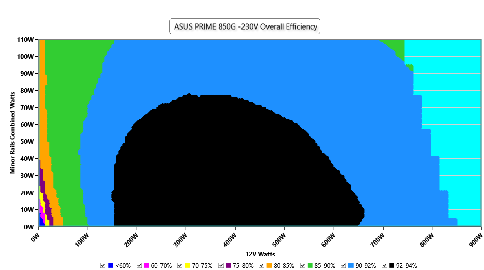 This graph depicts the PSU`s efficiency throughout its entire operational range. For the generation of the efficiency and noise graphs we set our loaders to auto mode through our custom-made software before trying thousands of possible load combinations
