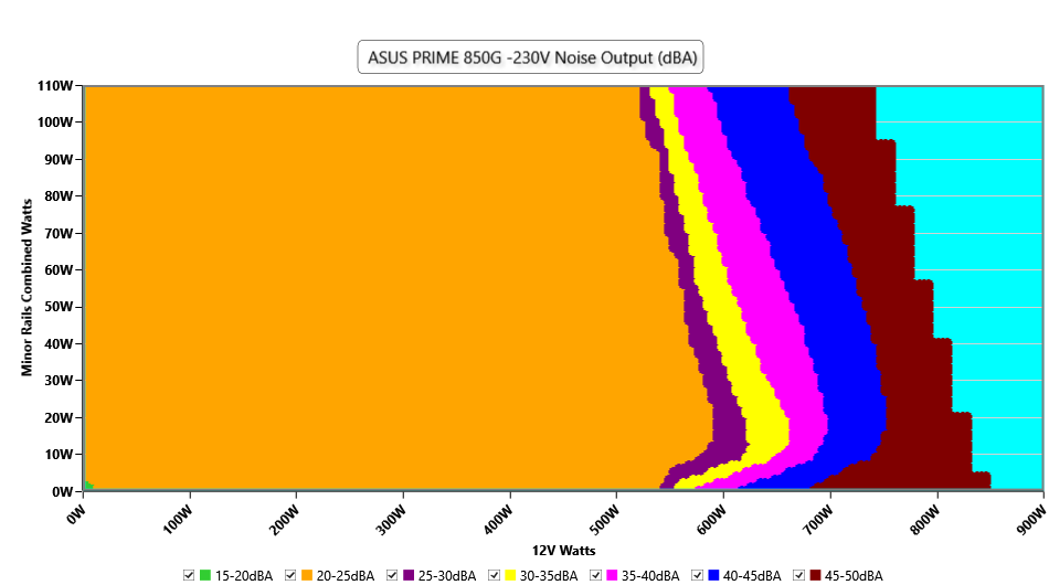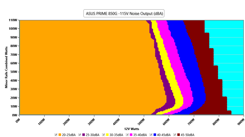The PSU`s noise in its entire operational range and under 30-32 °C ambient is depicted in this graph. The X axis represents the load on the +12V rail(s) while the Y axis is the load on the minor rails