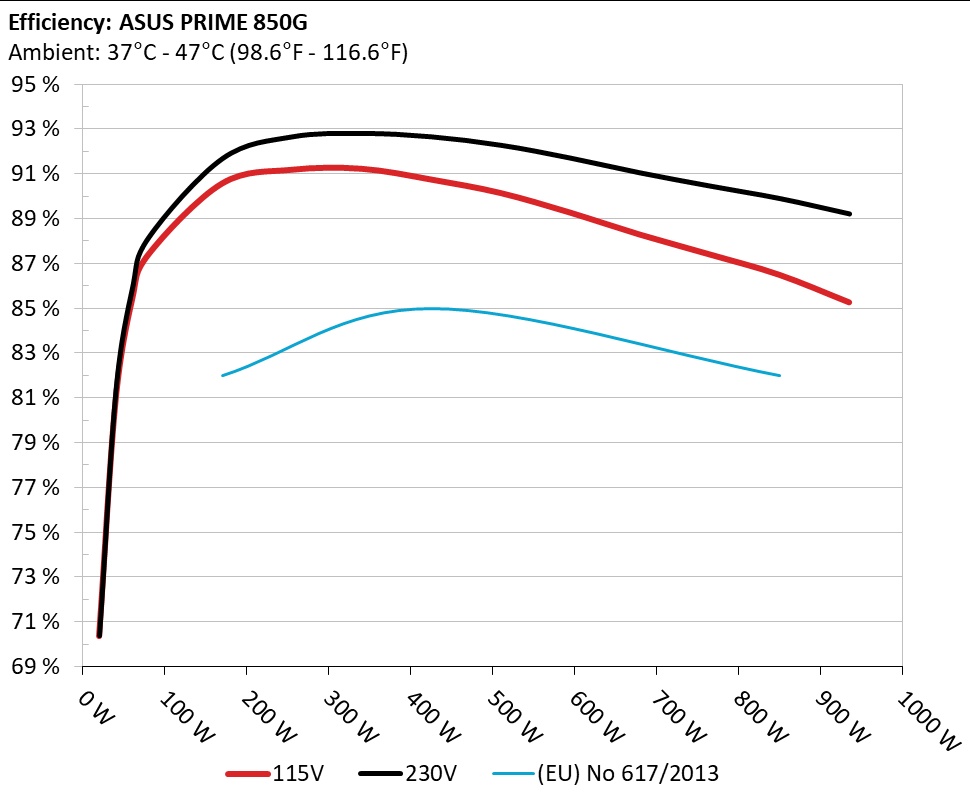 The PSU`s efficiency under high ambient temperatures with 115V and 230V input. For this graph the results of the 10-110% load regulation table are used