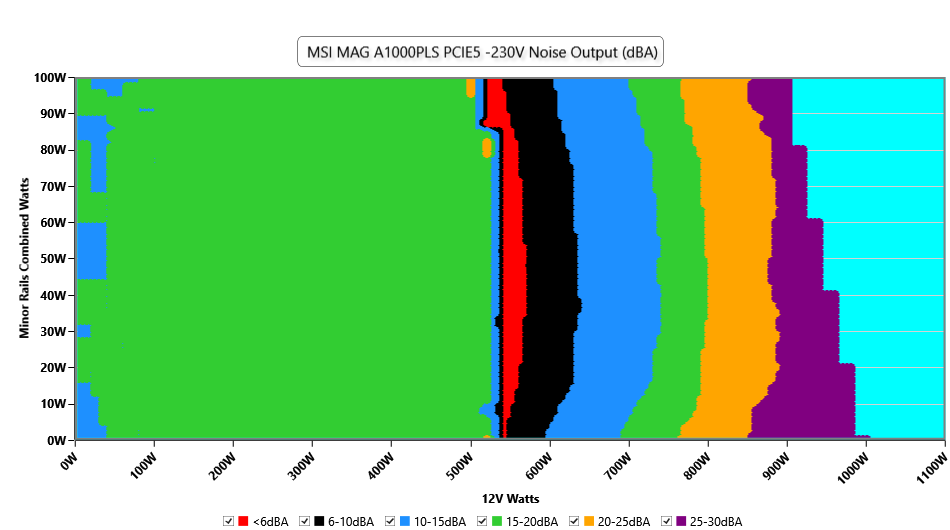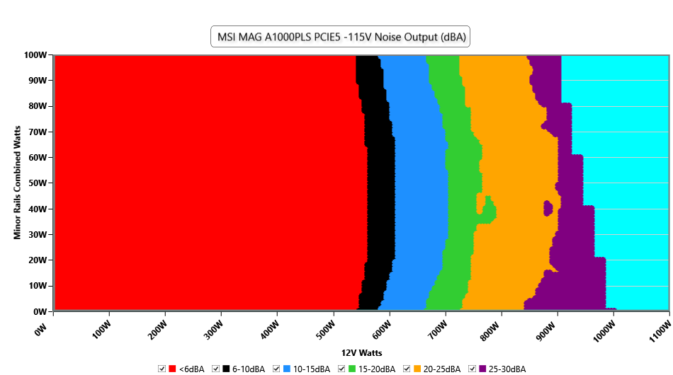 The PSU`s noise in its entire operational range and under 30-32 °C ambient is depicted in this graph. The X axis represents the load on the +12V rail(s) while the Y axis is the load on the minor rails