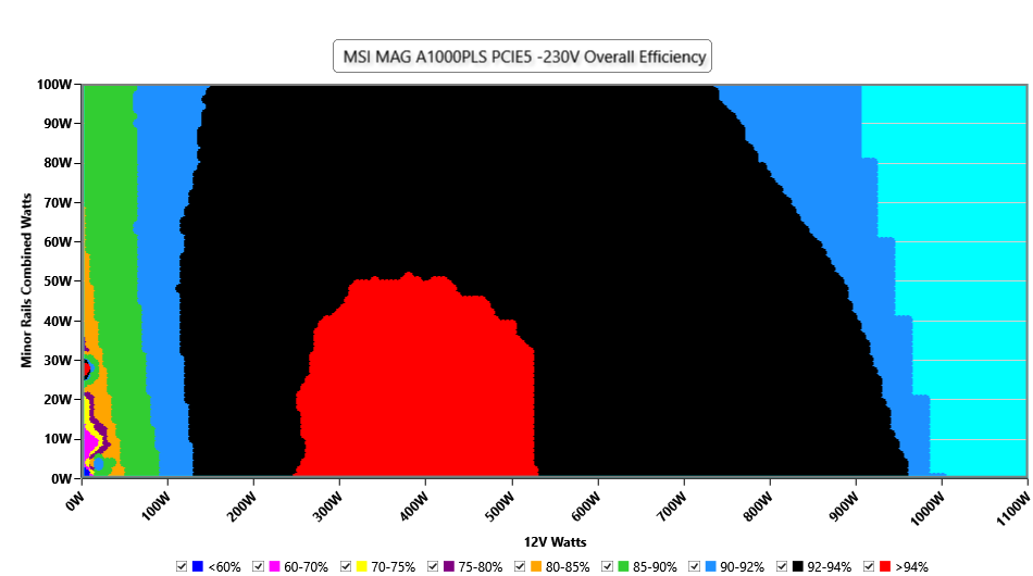 This graph depicts the PSU`s efficiency throughout its entire operational range. For the generation of the efficiency and noise graphs we set our loaders to auto mode through our custom-made software before trying thousands of possible load combinations