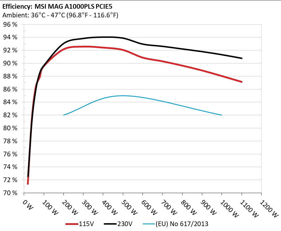 The PSU`s efficiency under high ambient temperatures with 115V and 230V input. For this graph the results of the 10-110% load regulation table are used