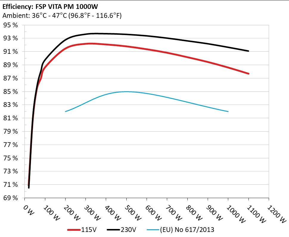 The PSU`s efficiency under high ambient temperatures with 115V and 230V input. For this graph the results of the 10-110% load regulation table are used
