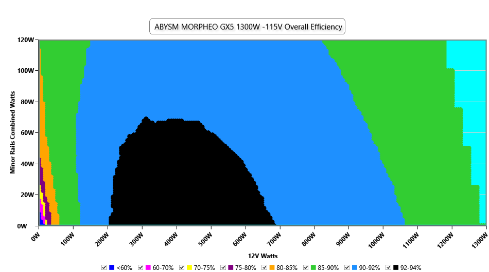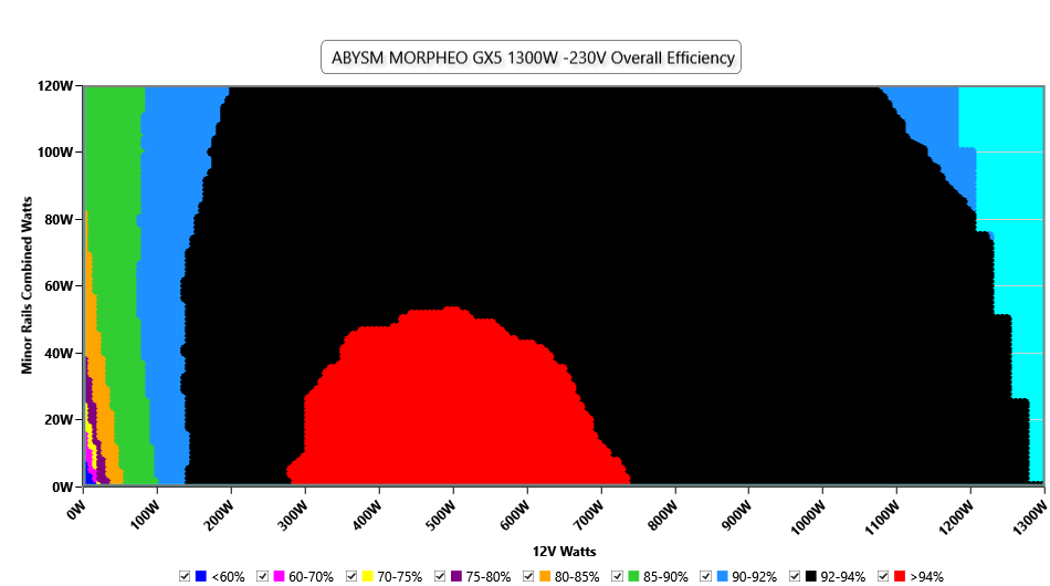 This graph depicts the PSU`s efficiency throughout its entire operational range. For the generation of the efficiency and noise graphs we set our loaders to auto mode through our custom-made software before trying thousands of possible load combinations