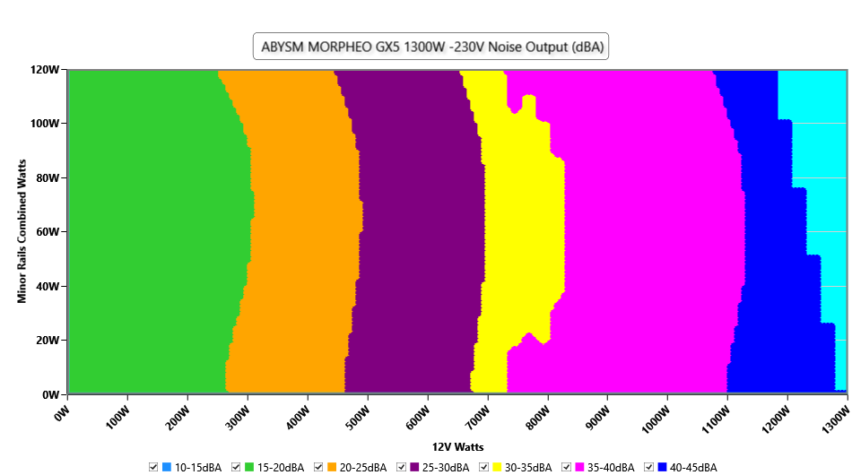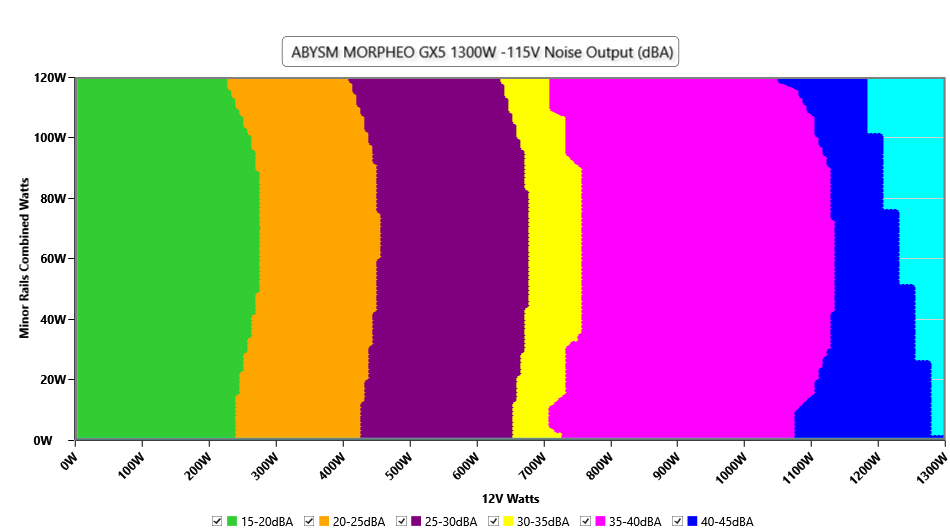 The PSU`s noise in its entire operational range and under 30-32 °C ambient is depicted in this graph. The X axis represents the load on the +12V rail(s) while the Y axis is the load on the minor rails