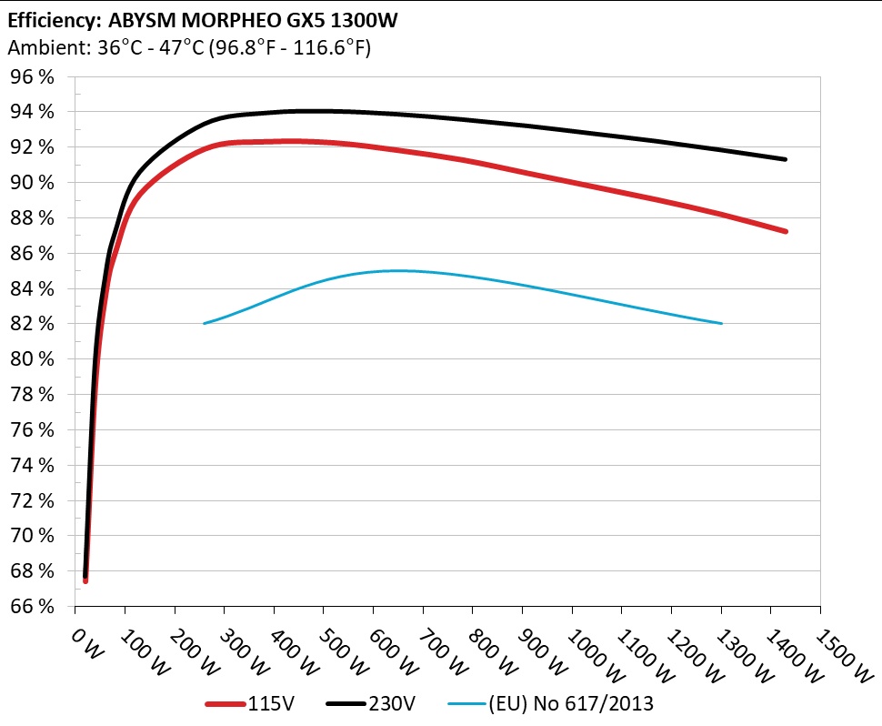 The PSU`s efficiency under high ambient temperatures with 115V and 230V input. For this graph the results of the 10-110% load regulation table are used