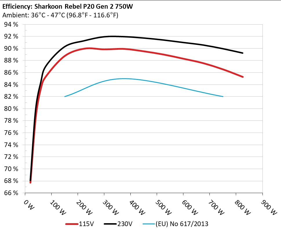 The PSU`s efficiency under high ambient temperatures with 115V and 230V input. For this graph the results of the 10-110% load regulation table are used