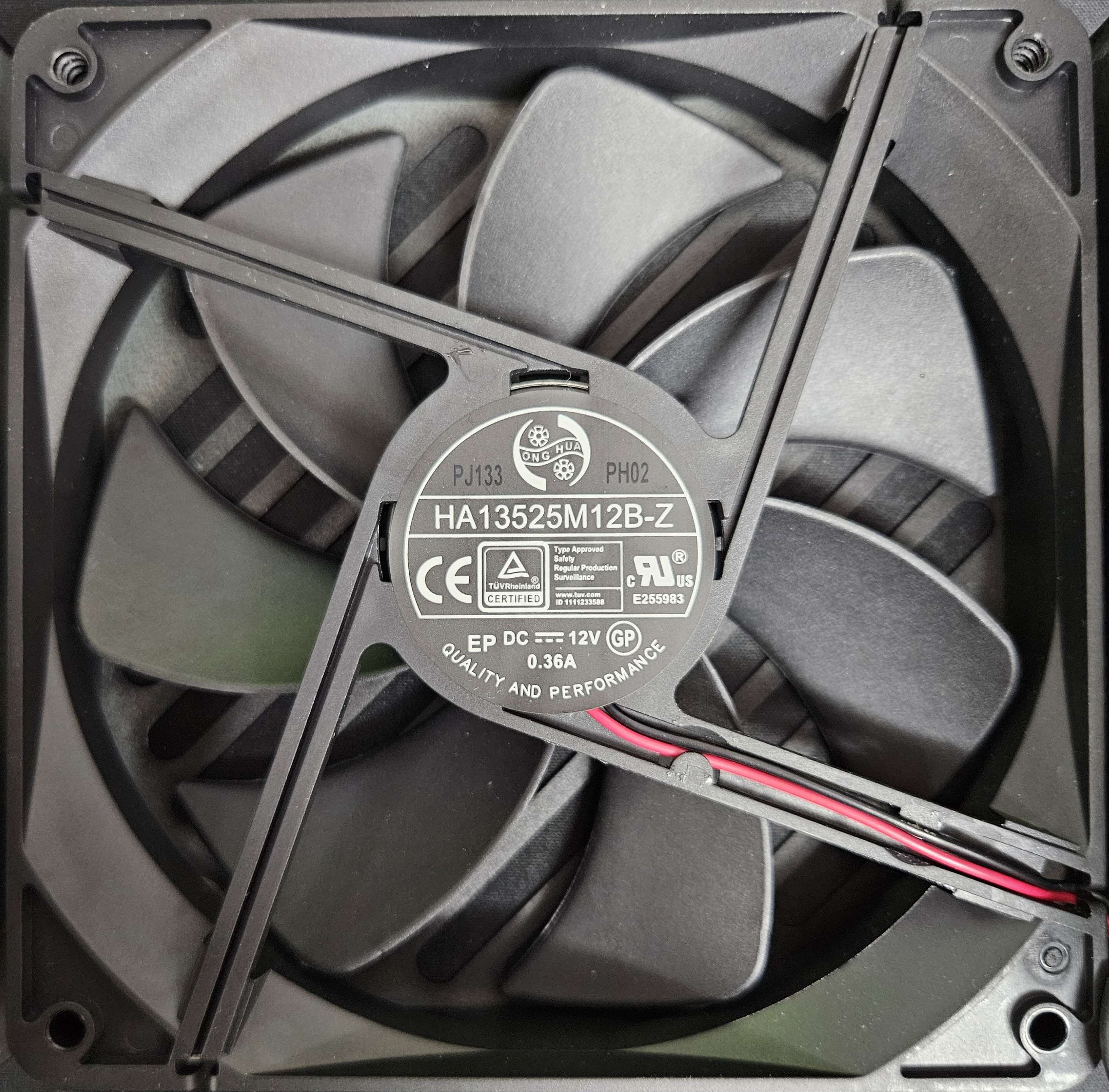 | Fan Model | Hong Hua HA13525M12B-Z (135mm, 12V, 0.36A, Dual Ball Bearing Fan) |