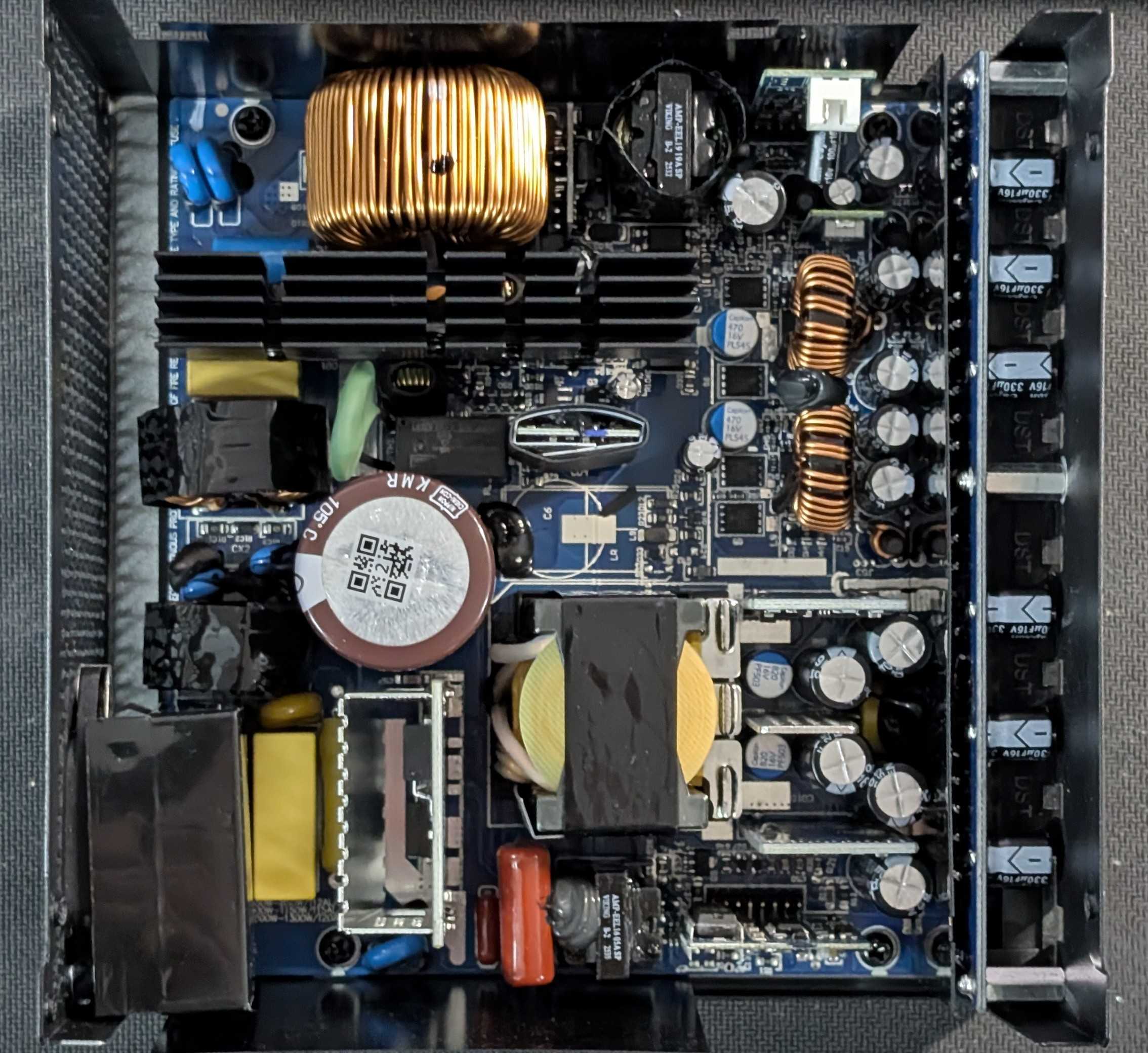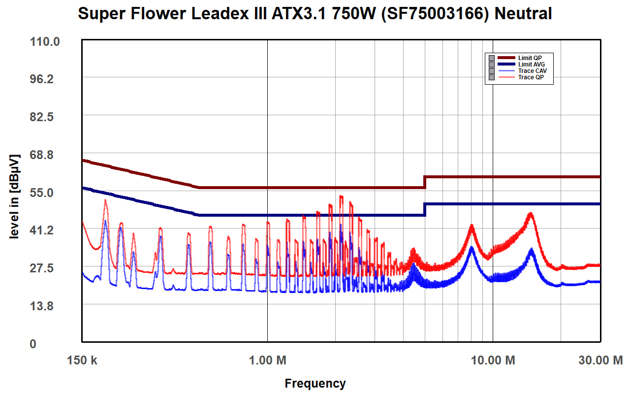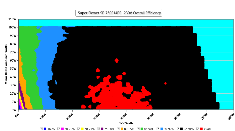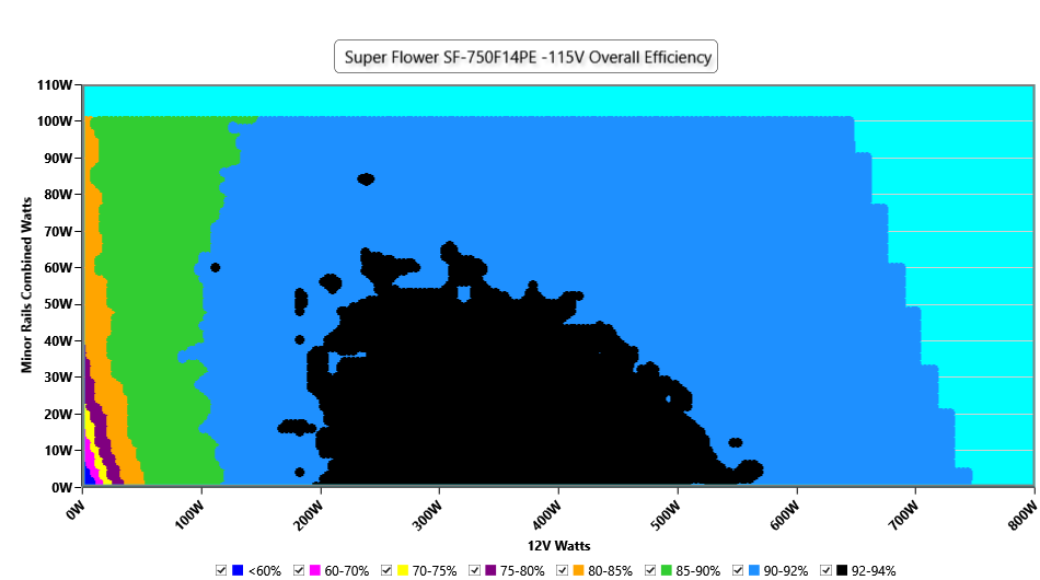 This graph depicts the PSU`s efficiency throughout its entire operational range. For the generation of the efficiency and noise graphs we set our loaders to auto mode through our custom-made software before trying thousands of possible load combinations