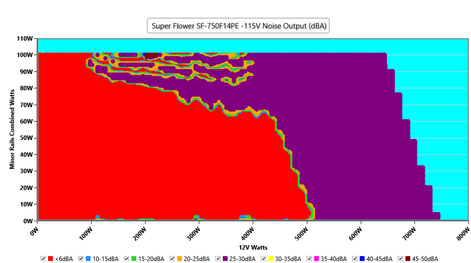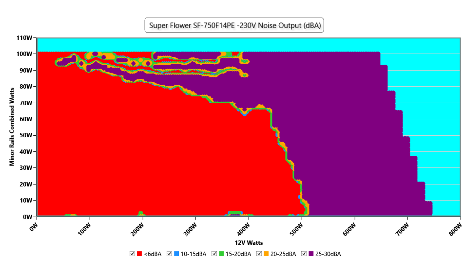 The PSU`s noise in its entire operational range and under 30-32 °C ambient is depicted in this graph. The X axis represents the load on the +12V rail(s) while the Y axis is the load on the minor rails