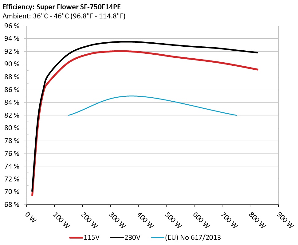 The PSU`s efficiency under high ambient temperatures with 115V and 230V input. For this graph the results of the 10-110% load regulation table are used